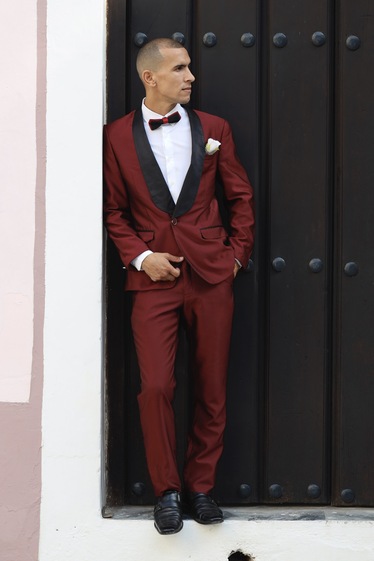 Traje color vino con zolapa negra, corte slim fit.