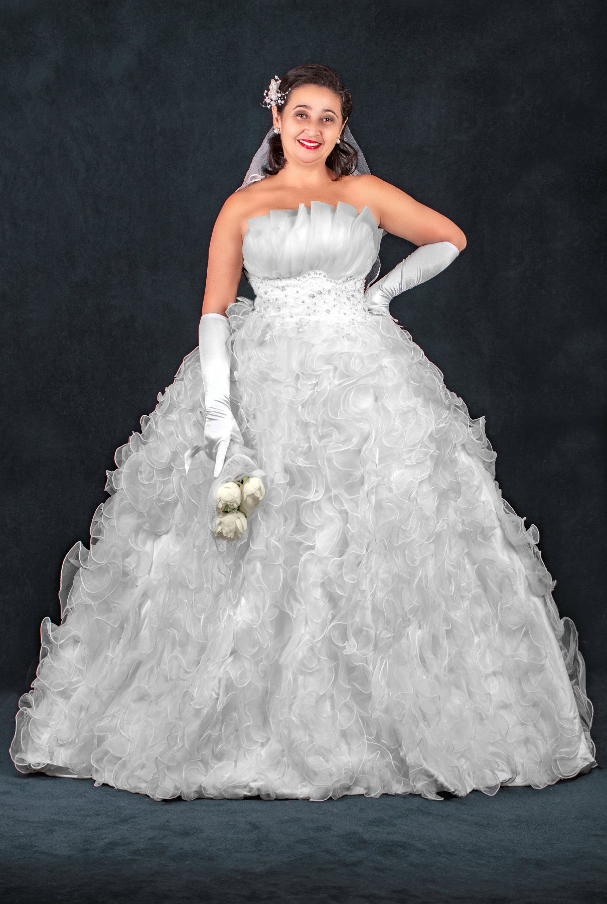 Vestido de novia modelo sirena, blanco con cola en capas y escote corazón