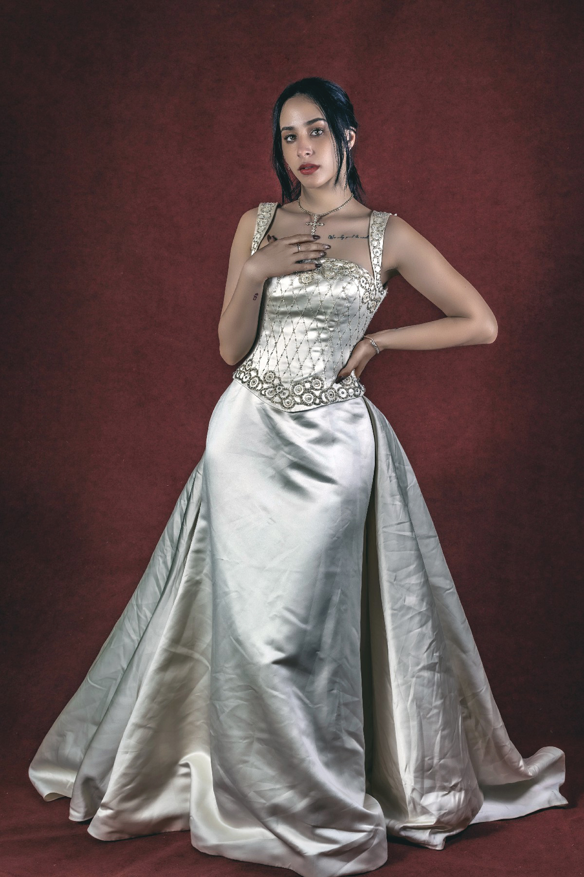 Vestido de novia 3 piezas color dorado, con incrustaciones de pedrería