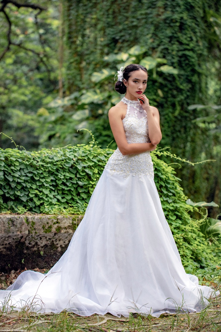 Vestido de novia blanco con pedrería corte línea A cuello alto