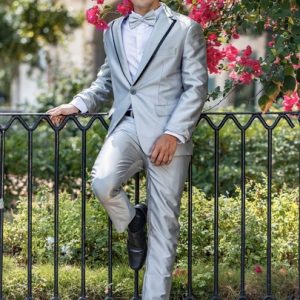 Traje satinado gris con detalles en negro, corte slimfit.