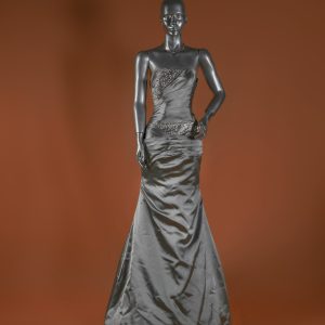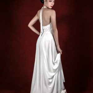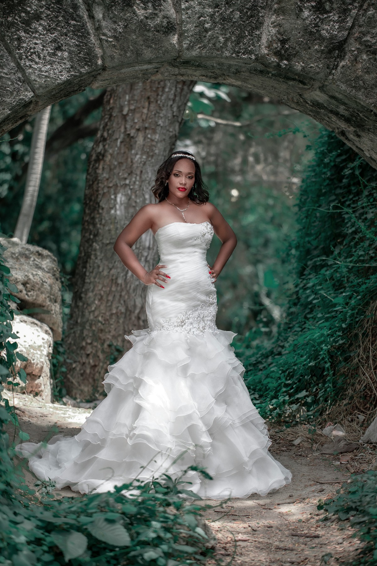 Vestido de novia modelo sirena, blanco con cola en capas y escote corazón