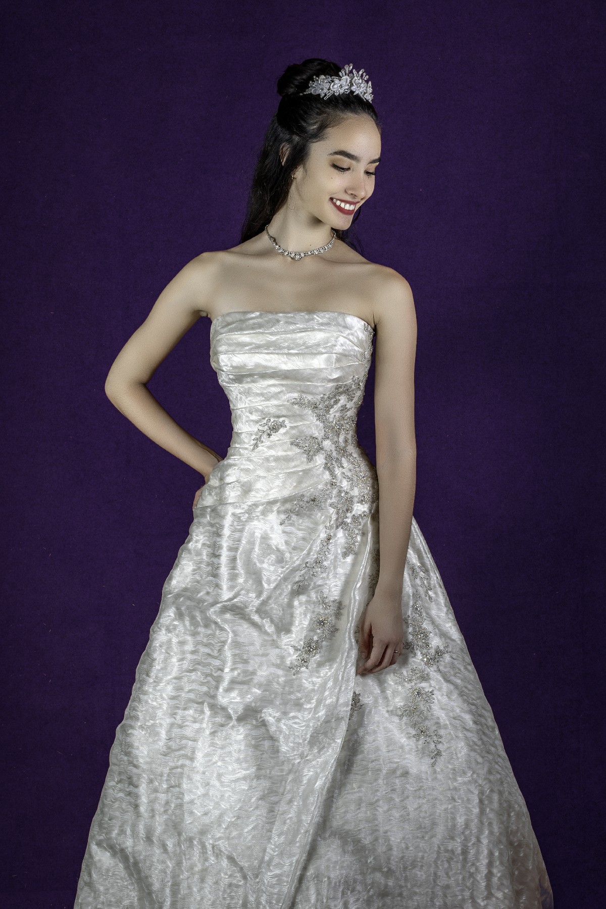 Vestido con pedreria en escote corazon, corte princesa color marfil